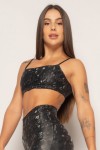 gente, esse material parece um vinil! recomendo pegar uma numeração maior! o P para o top ficou certinho, pois sou bem magrinha!